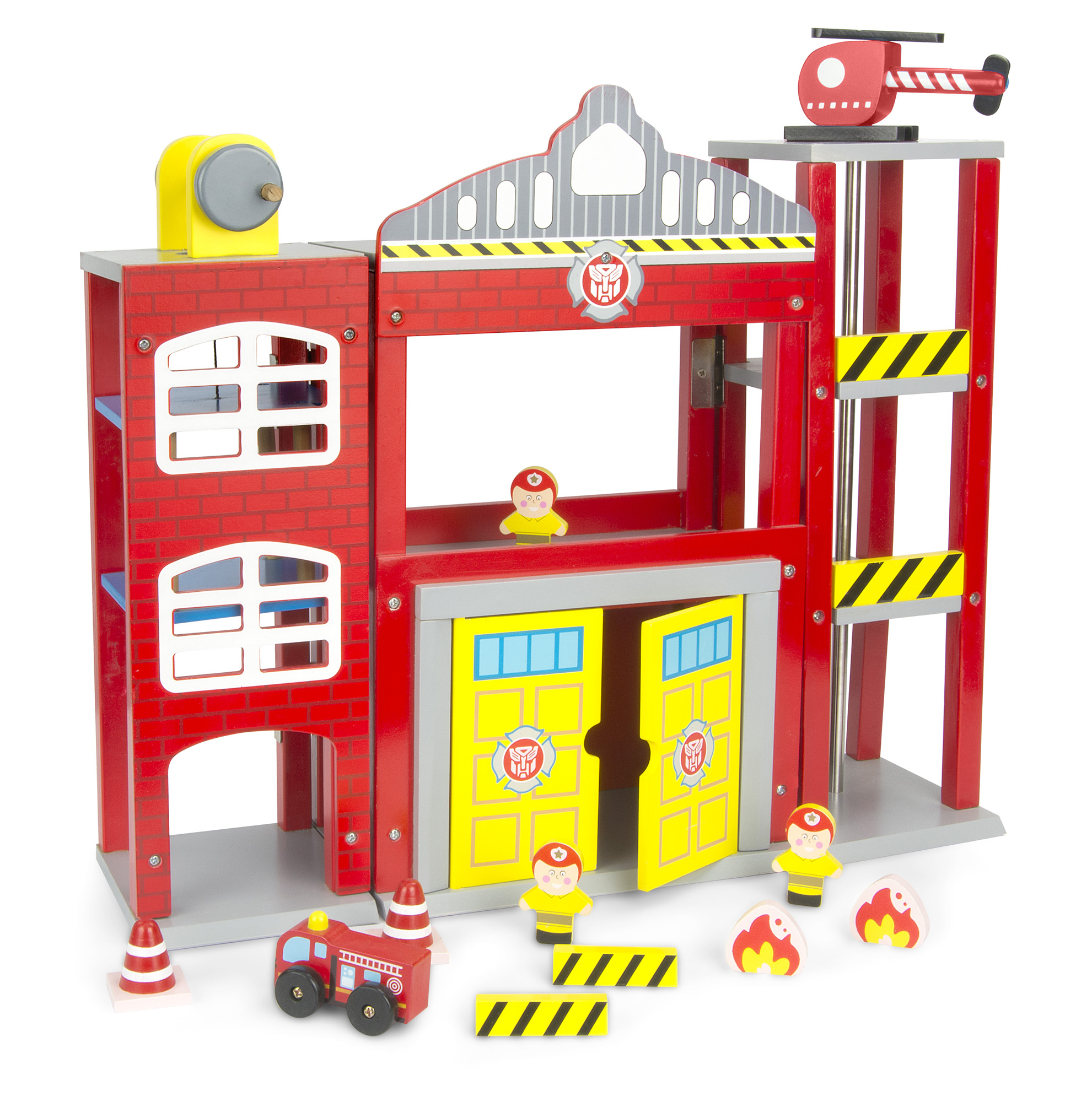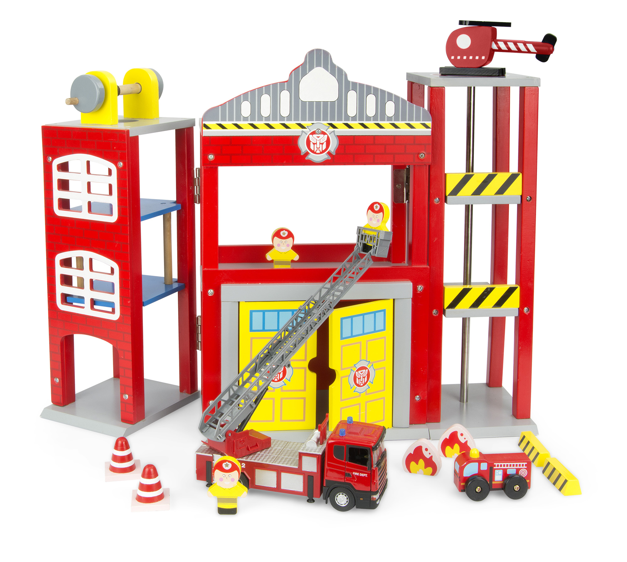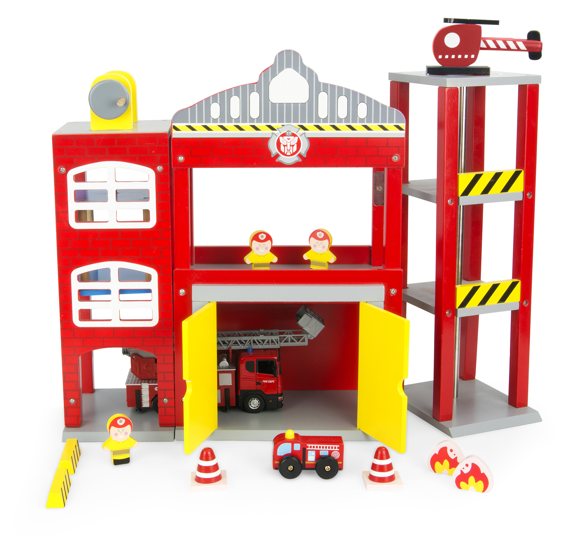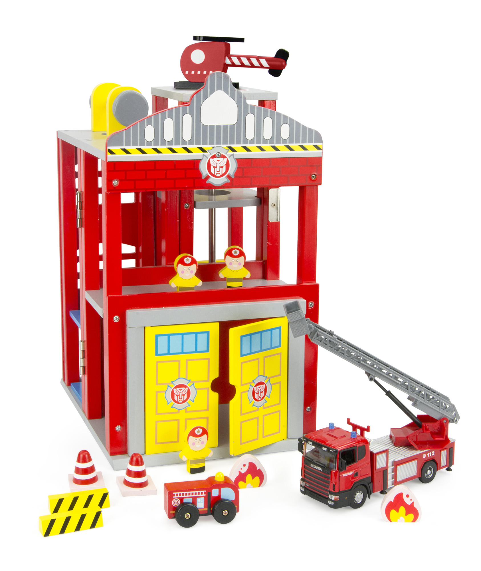 Gran estación de bomberos en dos variantes. El juguete tiene tres alas separadas. Por un lado hay un helipuerto con el tubo de descenso que conduce al garaje. Otro segmento es un garaje con las puertas grandes. Perfecto como un aparcamiento para el camión de bomberos. La tercera ala está equipada con un ascensor giratorio gracias al cual los bomberos pueden subir al segundo piso de estación. Contiene tres pequeños bomberos, helicóptero, dos camíones - un chichito de madera y segundo de metal - Scania, dos llamas de fuego. Camión Scania posee una licencia original. Tiene una escala telescópica que se extiende al altura de 33 cm y también 4 pies para mantener equilibrio durante la intervención en el caso del incendio. Sus puertas se abren de dos lados. Destinado a los niños a partir de 3 años.