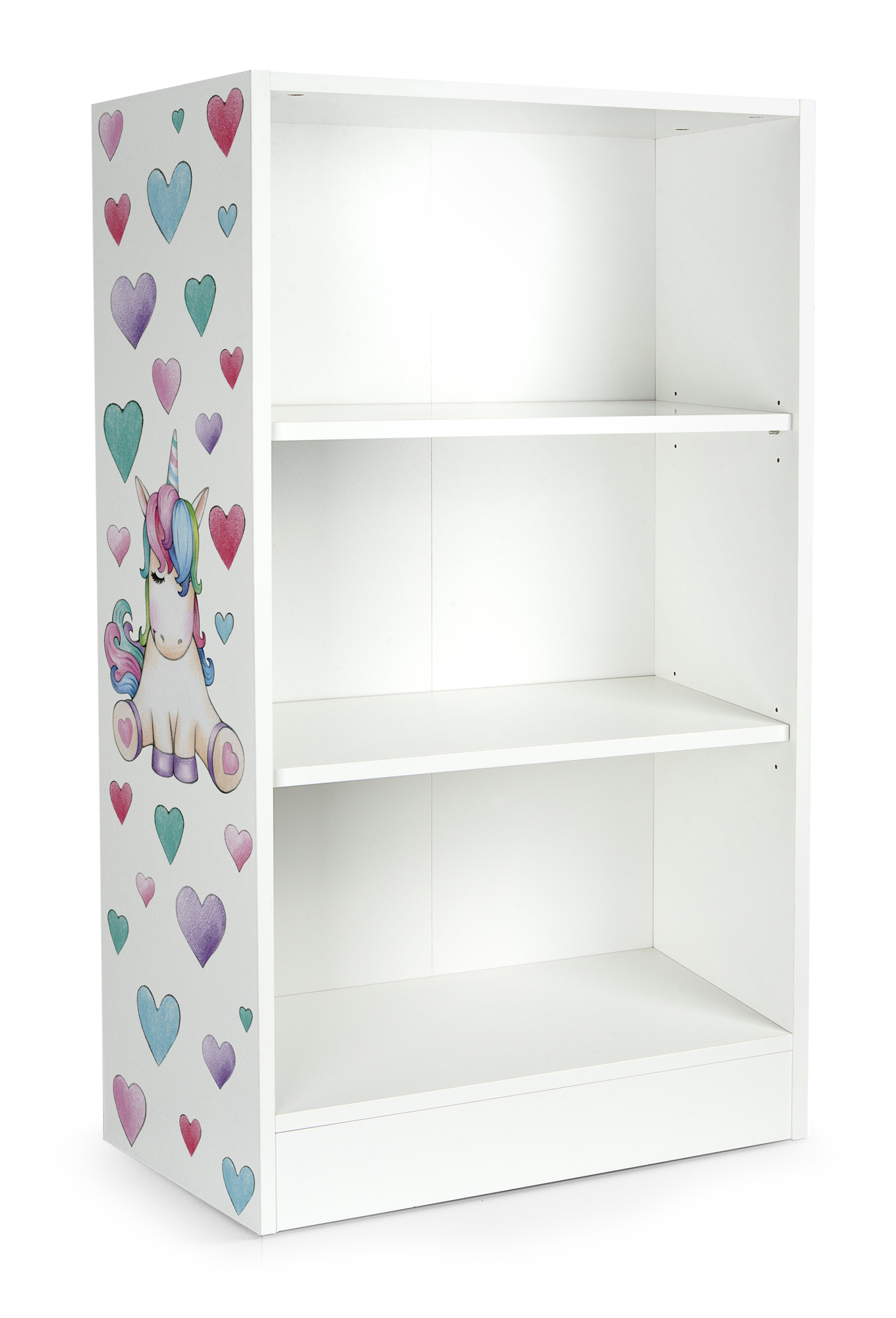 Estantería ideal para la habitación de un niño, para libros, juguetes, fotografías, DVDs. Una estantería blanca hecha de tablones de muebles de alta calidad con impresión UV.